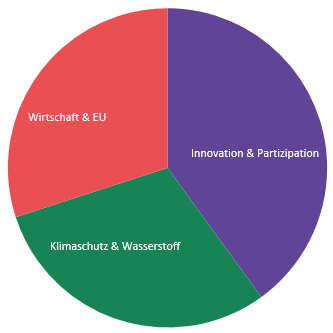 Die Bereiche Wirtschaft & EU 30% sowie Klimaschutz & Wasserstoff 30% liegen gleich auf, die Nase vorn hat der Bereich Innovation & Partizipation mit 40% im Umfrageergebnis vom Februar!